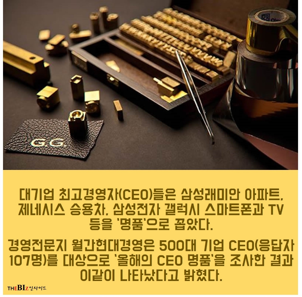 대기업 최고경영자(CEO)들은 삼성래미안 아파트, 제네시스 승용차, 삼성전자 갤럭시 스마트폰과 TV 등을 `명품`으로 꼽았다.