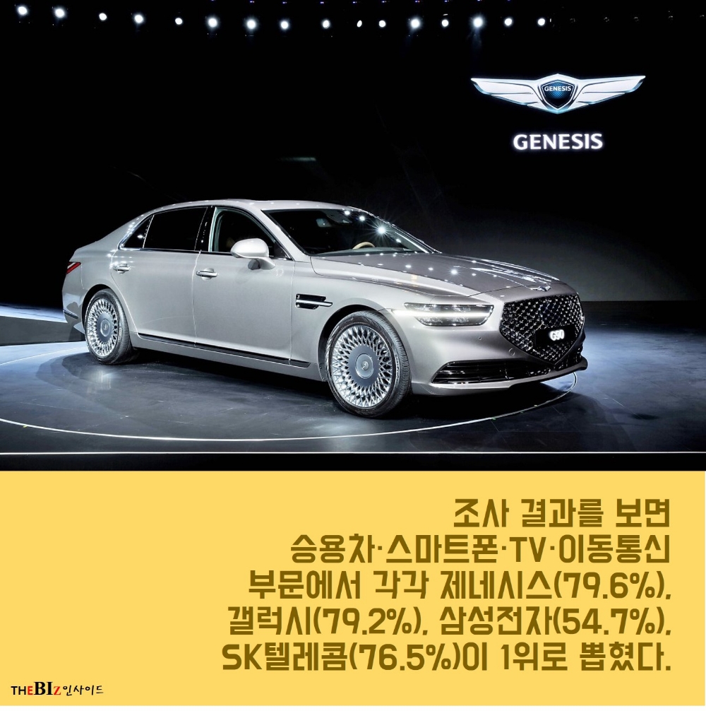조사 결과를 보면 승용차·스마트폰·TV·이동통신 부문에서 각각 제네시스(79.6%), 갤럭시(79.2%), 삼성전자(54.7%), SK텔레콤(76.5%)이 1위로 뽑혔다.