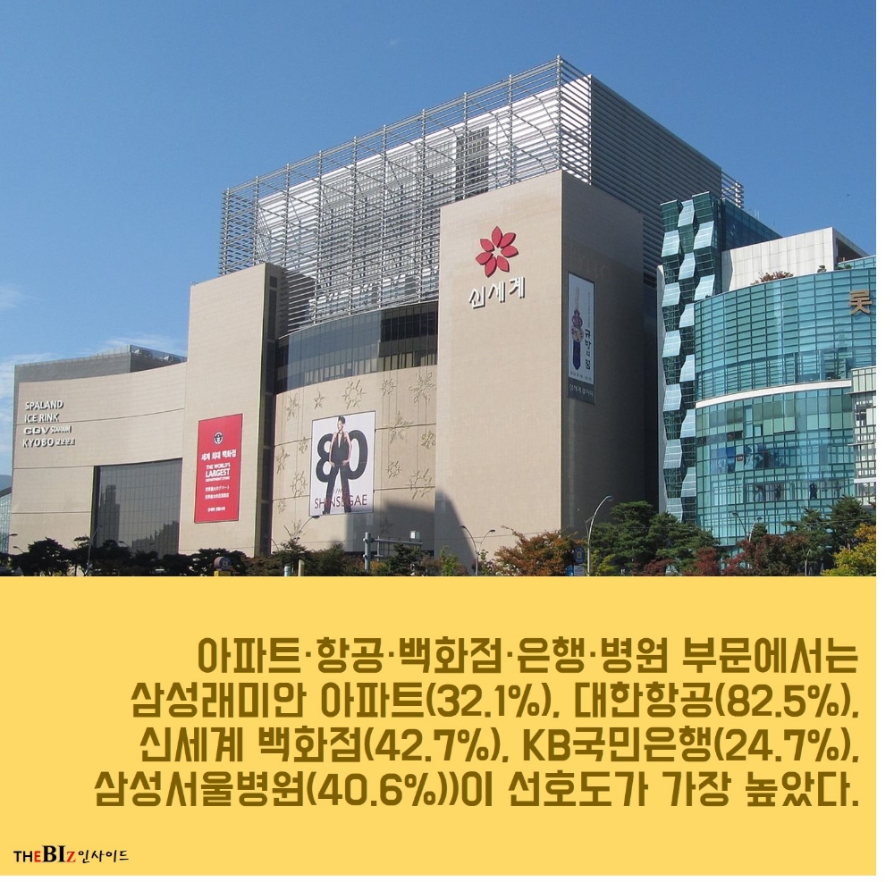 아파트·항공·백화점·은행·병원 부문에서는 삼성래미안 아파트(32.1%), 대한항공(82.5%), 신세계 백화점(42.7%), KB국민은행(24.7%), 삼성서울병원(40.6%))이 선호도가 가장 높았다.