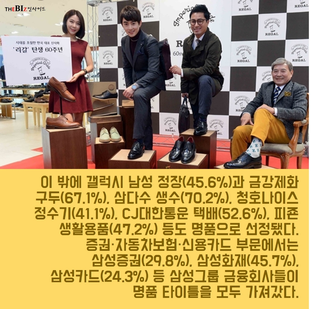 이 밖에 갤럭시 남성 정장(45.6%)과 금강제화 구두(67.1%), 삼다수 생수(70.2%), 청호나이스 정수기(41.1%), CJ대한통운 택배(52.6%), 피죤 생활용품(47.2%) 등도 명품으로 선정됐다.