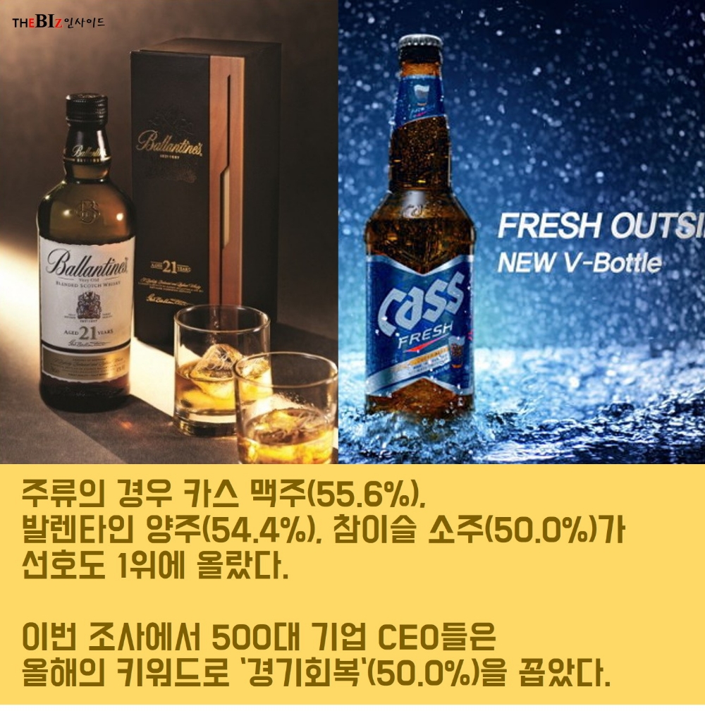 주류의 경우 카스 맥주(55.6%), 발렌타인 양주(54.4%), 참이슬 소주(50.0%)가 선호도 1위에 올랐다.