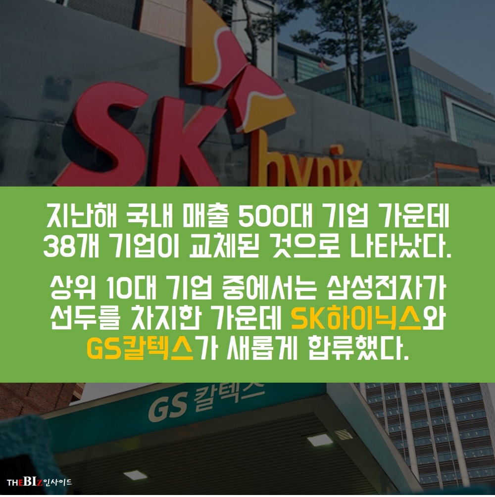 지난해 국내 매출 500대 기업 가운데 38개 기업이 교체된 것으로 나타났다. 상위 10대 기업 중에서는 삼성전자가 압도적인 선두를 차지한 가운데 SK하이닉스와 GS칼텍스가 새롭게 합류했다.