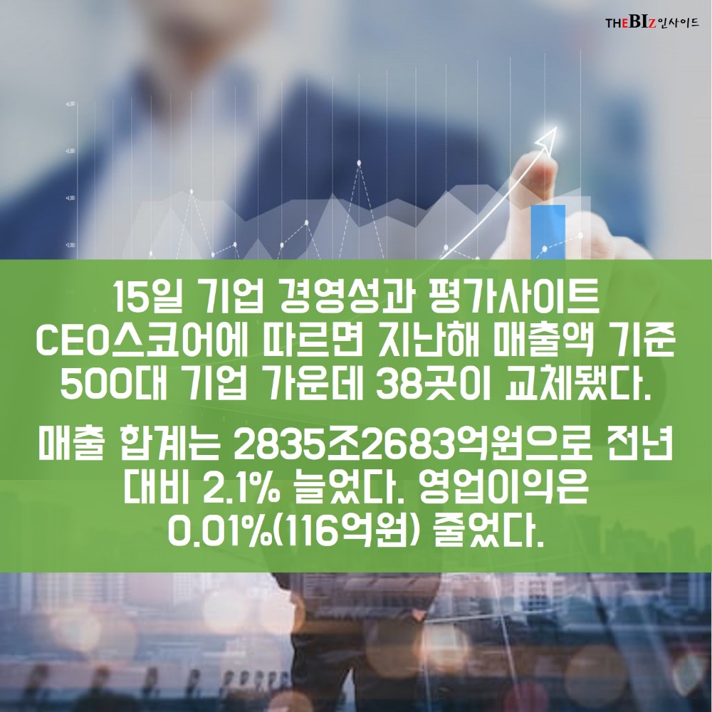 15일 기업 경영성과 평가사이트 CEO스코어에 따르면 지난해 매출액 기준 500대 기업 가운데 38곳이 교체됐다. 매출 합계는 2835조2683억원으로 전년 대비 2.1% 늘었다. 영업이익은 0.01%(116억원) 줄었다.