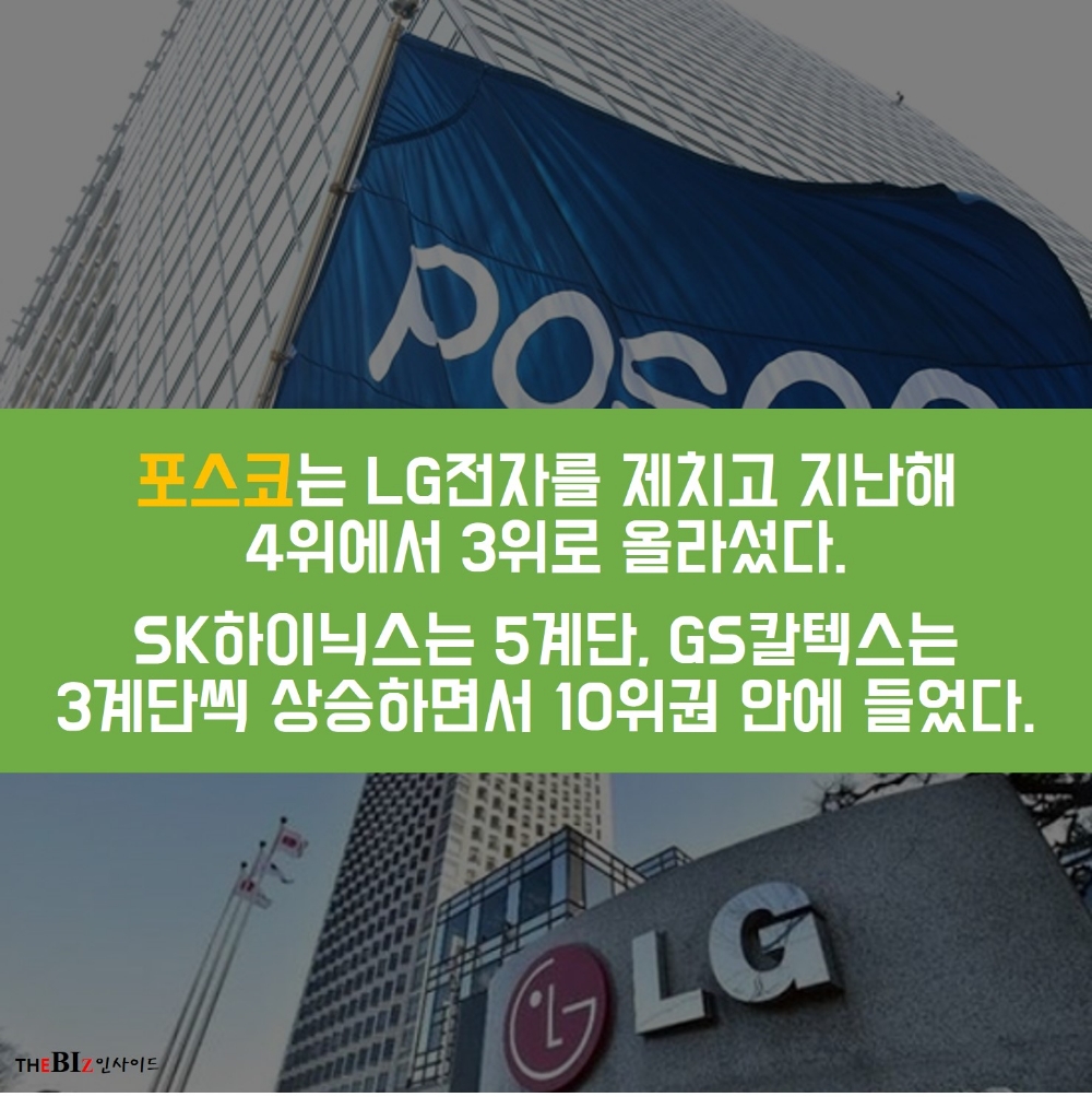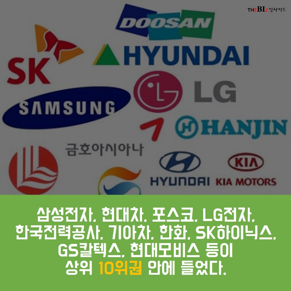 삼성전자, 현대차, 포스코, LG전자, 한국전력공사, 기아차, 한화, SK하이닉스, GS칼텍스, 현대모비스 등이 상위 10위권 안에 들었다. 포스코는 LG전자를 제치고 지난해 4위에서 3위로 올라섰다.