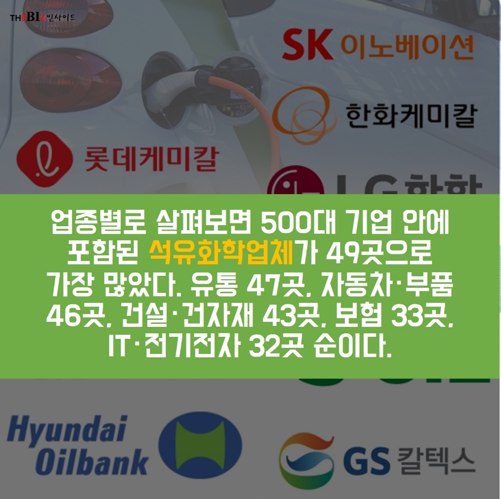 업종별로 살펴보면 500대 기업 안에 포함된 석유화학업체가 49곳으로 가장 많았다. 유통 47곳, 자동차‧부품 46곳, 건설‧건자재 43곳, 보험 33곳, IT‧전기전자 32곳 순이다.