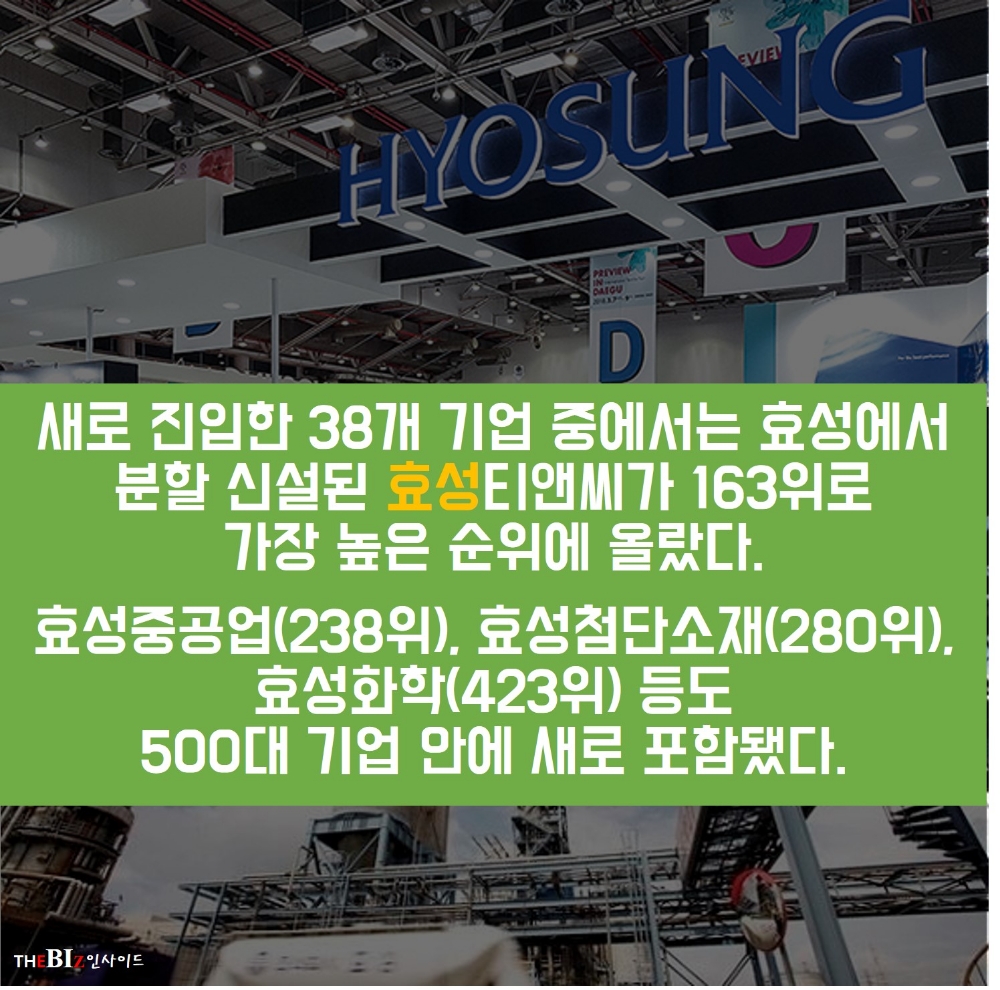 새로 진입한 38개 기업 중에서는 효성에서 분할 신설된 효성티앤씨가 163위로 가장 높은 순위에 올랐다. 효성중공업(238위), 효성첨단소재(280위), 효성화학(423위) 등도 500대 기업 안에 새로 포함됐다.