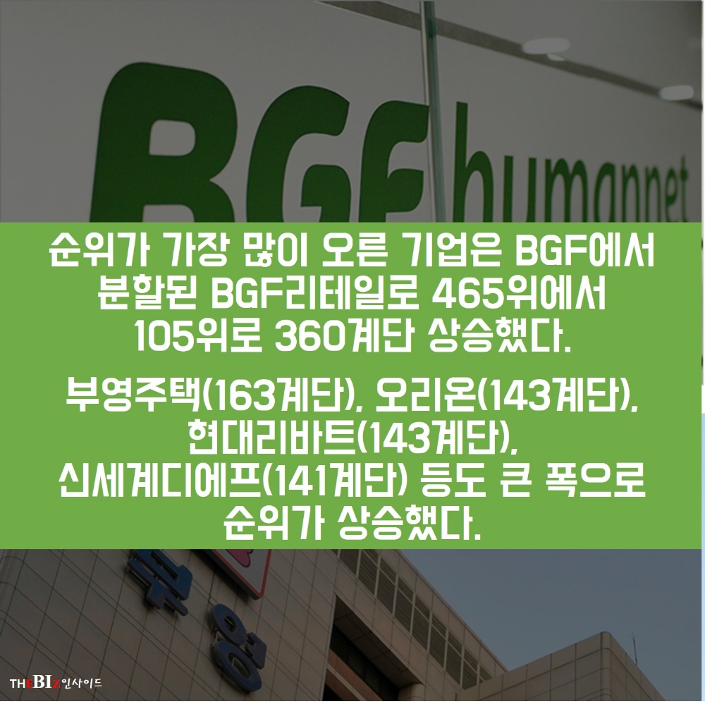 순위가 가장 많이 오른 기업은 BGF에서 분할된 BGF리테일로 465위에서 105위로 360계단 상승했다. 부영주택(163계단), 오리온(143계단), 현대리바트(143계단), 신세계디에프(141계단) 등도 큰 폭으로 순위가 상승했다.