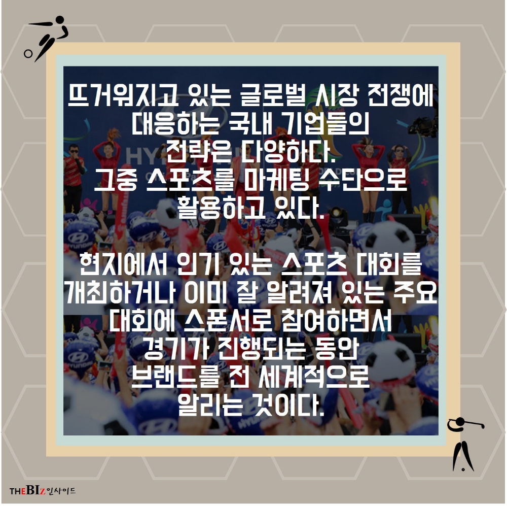 뜨거워지고 있는 글로벌 시장 전쟁에 대응하는 국내 기업들의 전략은 다양하다. 해외 진출을 앞두고 있거나, 해외에서의 인지도를 높이려는 국내 기업들이 스포츠를 마케팅 수단으로 활용하고 있다.