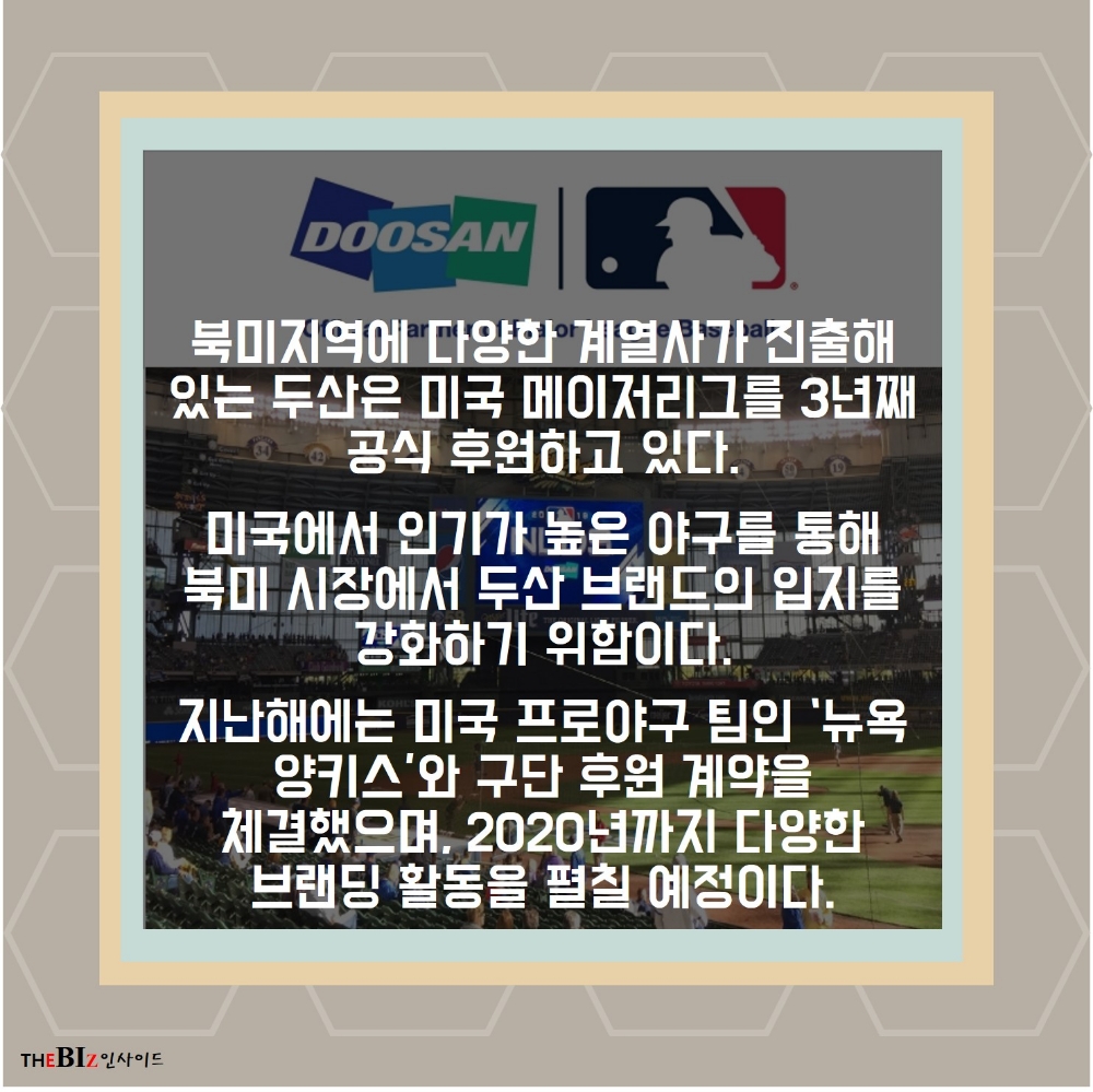 북미지역에 다양한 계열사가 진출해 있는 두산은 미국 메이저리그를 3년째 공식 후원하고 있다. 미국에서 인기가 높은 야구를 통해 북미 시장에서 두산 브랜드의 입지를 강화하기 위함이다.
