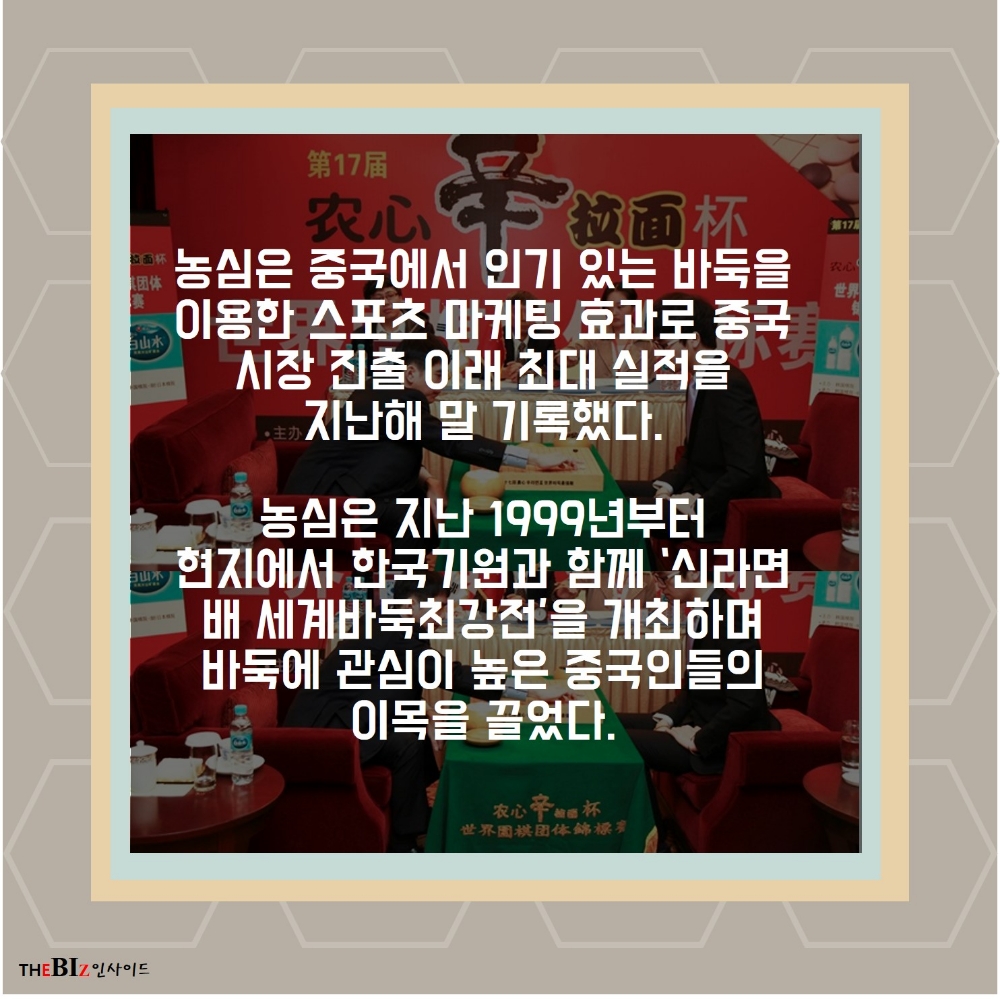 농심은 지난 1999년부터 현지에서 한국기원과 함께 ‘신라면 배 세계바둑최강전’을 개최하며 바둑에 관심이 높은 중국인들의 이목을 끌었다. 지난해 20회를 맞은 ‘신라면 배 세계바둑최강전’은 농심의 ‘辛(신)의 한 수’로 평가받기도 했으며 수백억 원에 달하는 마케팅 효과를 거둔 것으로 알려졌다.