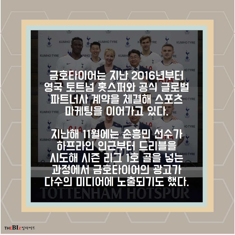 최근 토트넘 홋스퍼 신구장 개장 후 펼쳐진 손흥민(토트넘 홋스퍼) 선수의 맹활약이 브랜드 이미지에 긍정적 작용하고 있으며, 지난해 11월에는 손흥민 선수가 하프라인 인근부터 드리블을 시도해 시즌 리그 1호 골을 넣는 과정에서 금호타이어의 광고가 다수의 미디어에 노출되기도 했다.