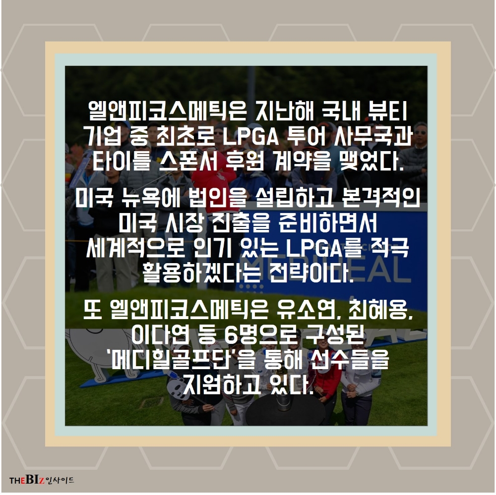 엘앤피코스메틱은 지난해 국내 뷰티 기업 중 최초로 LPGA 투어 사무국과 타이틀 스폰서 후원 계약을 맺었다. 미국 뉴욕에 법인을 설립하고 본격적인 미국 시장 진출을 준비하면서 세계적으로 인기 있는 LPGA를 적극 활용하겠다는 전략이다.