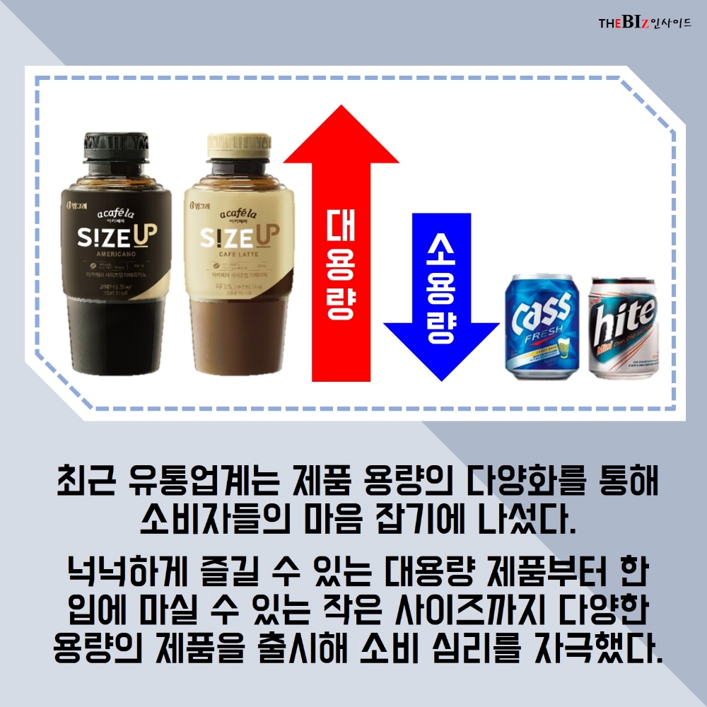 최근 유통업계는 제품 용량의 다양화를 통해 소비자들의 마음 잡기에 나섰다. 넉넉하게 즐길 수 있는 대용량 제품부터 한 입에 마실 수 있는 작은 사이즈까지 다양한 용량의 제품을 출시해 소비 심리를 자극하고 있다.