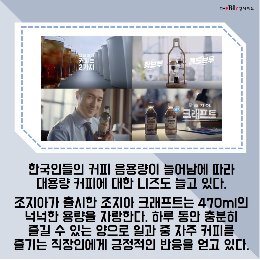 조지아가 출시한 조지아 크래프트는 470ml의 넉넉한 용량을 자랑한다. 하루 동안 충분히 즐길 수 있는 양으로 일과 중 자주 커피를 즐기는 직장인에게 긍정적인 반응을 얻고 있다.