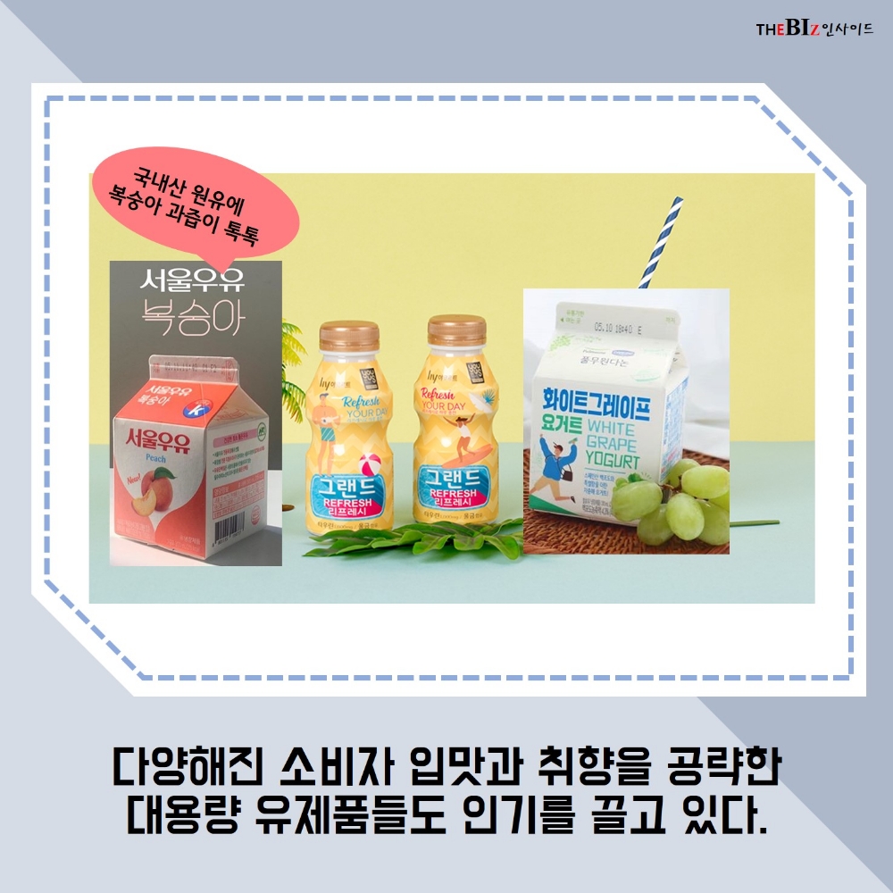 대용량 유제품들도 인기를 끌고 있다. 서울우유는 최근 300ml 용량의 ‘서울우유 복숭아’를 출시했다. 신선한 국내산 원유에 복숭아 과즙을 더했고 지방을 2%로 줄인 저지방우유로 가볍게 즐기기 좋다.