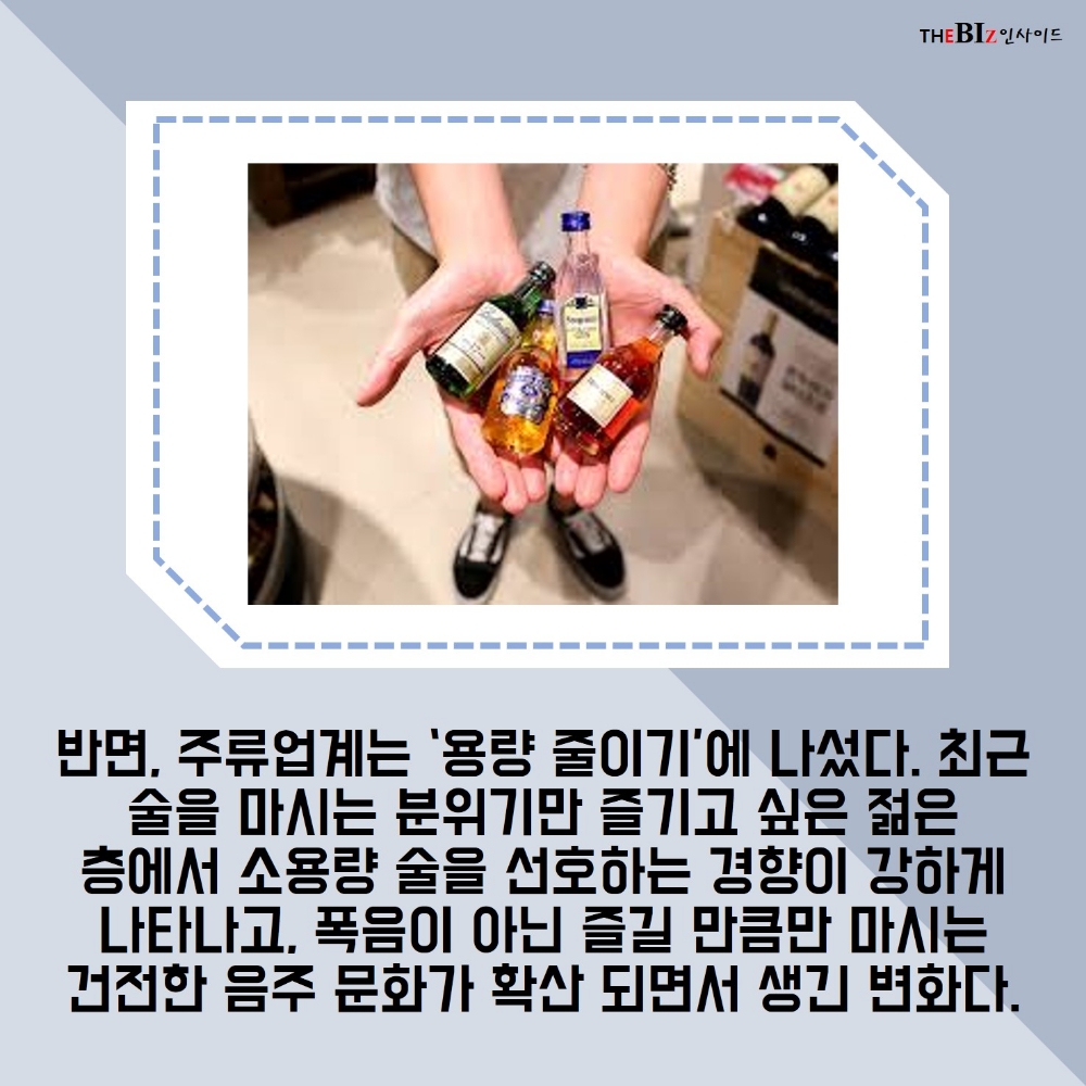 반면, 주류업계는 ‘용량 줄이기’에 나섰다. 최근 술을 마시는 분위기만 즐기고 싶은 젊은 층에서 소용량 술을 선호하는 경향이 강하게 나타나고, 폭음이 아닌 즐길 만큼만 마시는 건전한 음주 문화가 확산 되면서 생긴 변화다.