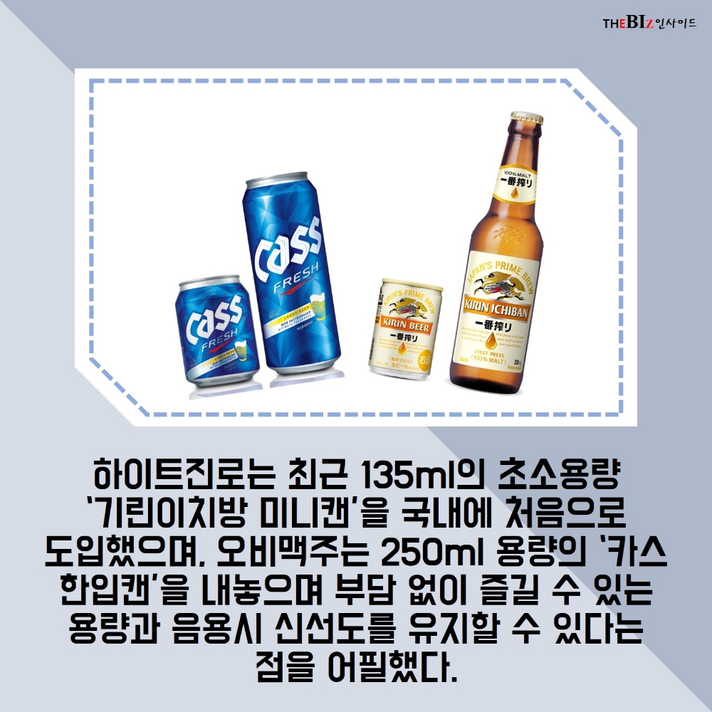 하이트진로는 최근 135ml의 초소용량 ‘기린이치방 미니캔’을 국내에 처음으로 도입했으며, 오비맥주는 250ml 용량의 ‘카스 한입캔’을 내놓으며 부담 없이 즐길 수 있는 용량과 음용시 신선도를 유지할 수 있다는 점을 어필했다.