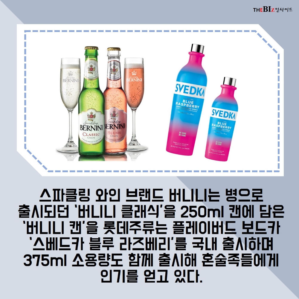 스파클링 와인 브랜드 버니니는 병으로 출시되던 ‘버니니 클래식’을 250ml 캔에 담은 ‘버니니 캔’을 롯데주류는 플레이버드 보드카 ‘스베드카 블루 라즈베리’를 국내 출시하며 375ml 소용량도 함께 출시해 혼술족들에게 인기를 얻고 있다.