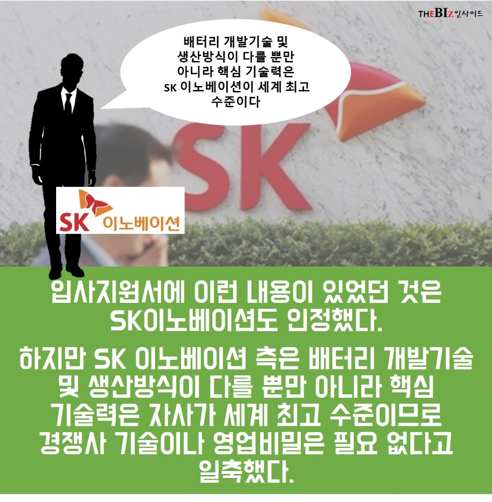 특히 배터리 개발기술 및 생산방식이 다를뿐만 아니라 핵심 기술력은 SK 이노베이션측이 세계 최고 수준이므로 경쟁사 기술이나 영업비밀은 필요 없다는 것.