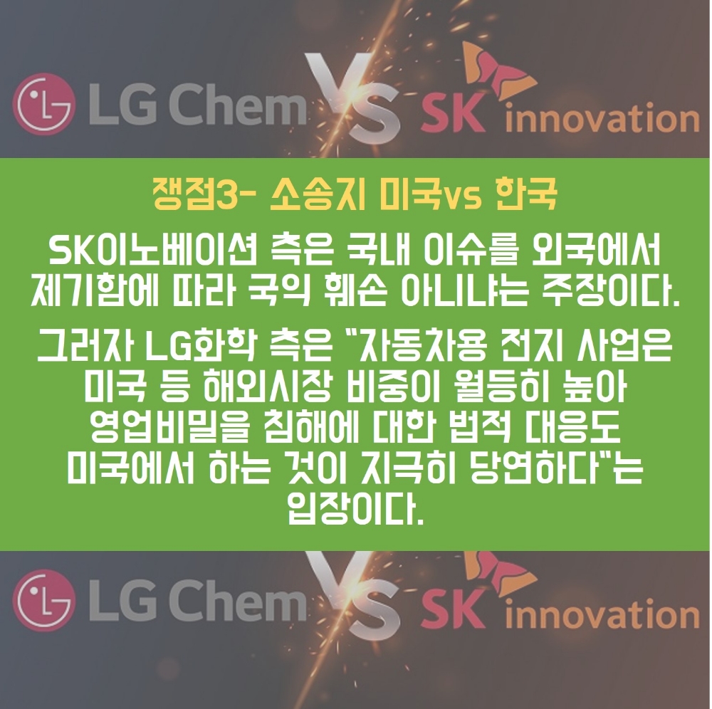 세번째 쟁점은 미국과 한국에서 맞붙은 소송전이다. SK이노베이션 측은 국내 이슈를 외국에서 제기함에 따라 국익 훼손 아니냐는 주장이다.