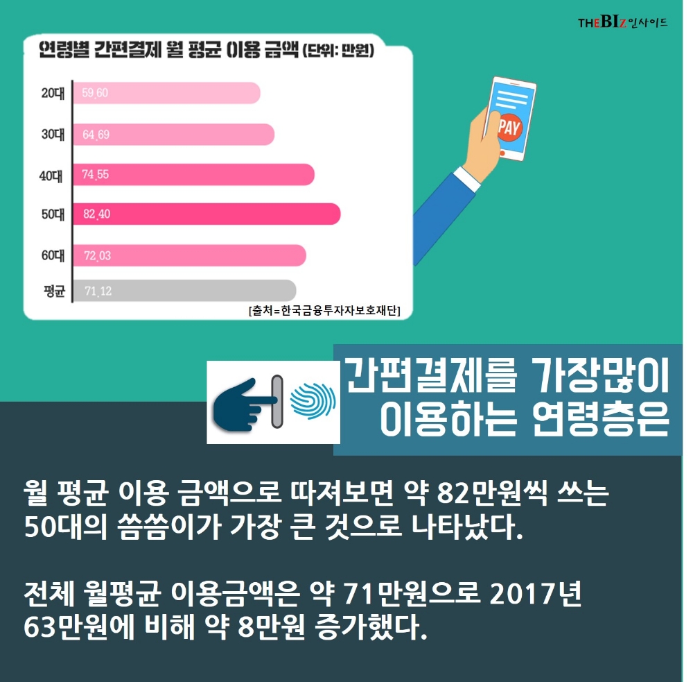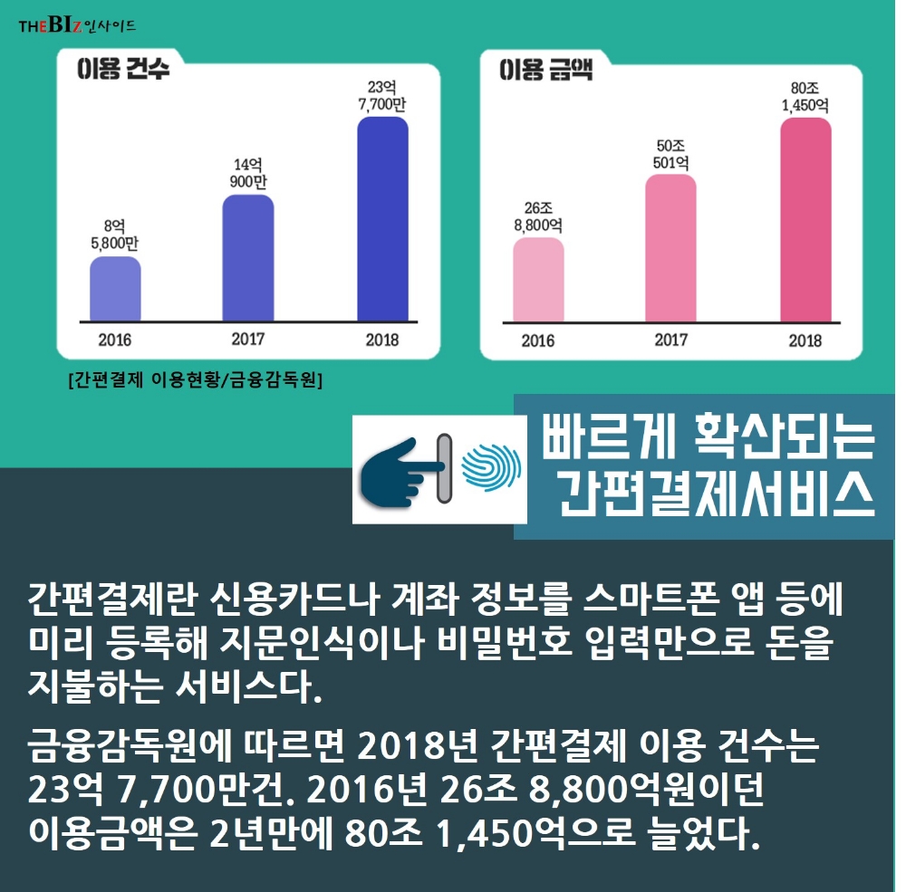 간편결제란 신용카드나 계좌 정보를 스마트폰 앱 등에 미리 등록해 지문인식이나 비밀번호 입력만으로 돈을 지불하는 서비스다. 금융감독원에 따르면 2018년 간편결제 이용 건수는 23억 7,700만건. 2016년 26조 8,800억원이던 이용금액은 2년만에 80조 1,450억으로 늘었다.