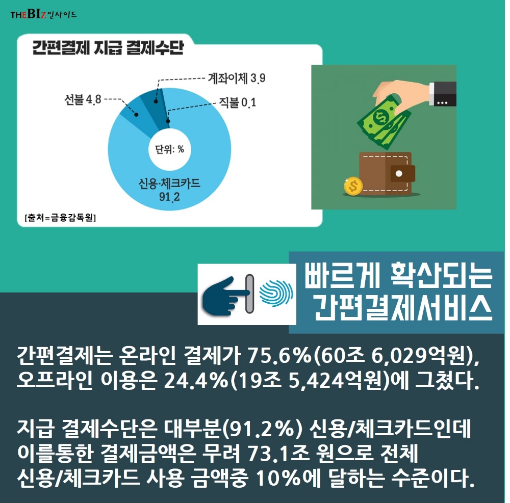 간편결제는 온라인 결제가 75.6%(60조 6,029억원), 오프라인 이용은 24.4%(19조 5,424억원)에 그쳤다. 지급 결제수단은 대부분(91.2%) 신용/체크카드인데 이를통한 결제금액은 무려 73.1조 원으로 전체 신용/체크카드 사용 금액중 10%에 달하는 수준이다.