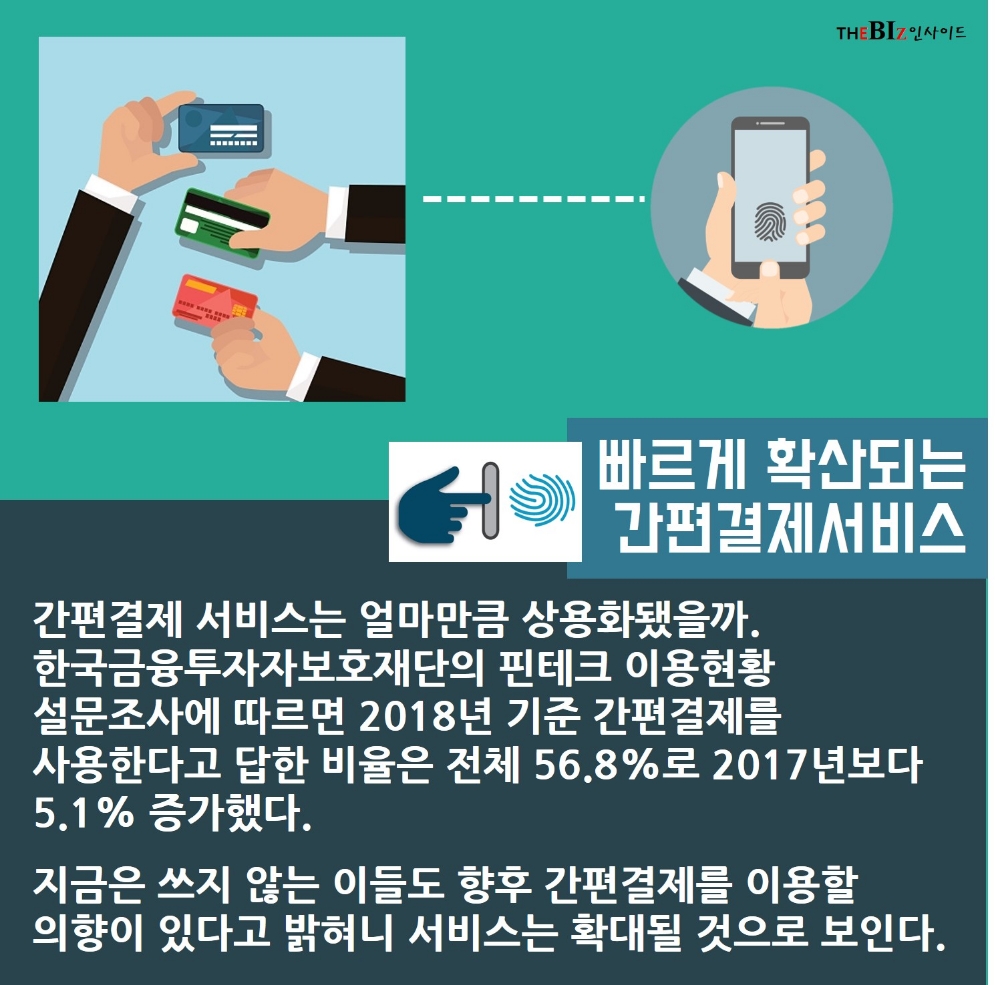 간편결제 서비스는 얼마만큼 상용화됐을까. 한국금융투자자보호재단의 핀테크 이용현황 설문조사에 따르면 2018년 기준 간편결제를 사용한다고 답한 비율은 전체 56.8%로 2017년보다 5.1% 증가했다. 지금은 쓰지 않는 이들도 향후 간편결제를 이용할 의향이 있다고 밝혔으니 서비스는 확대될 것으로 보인다.