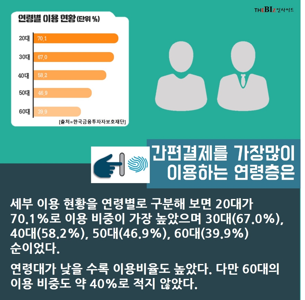 세부 이용 현황을 연령별로 구분해 보면 20대가 70.1%로 이용 비중이 가장 높았으며 30대(67.0%), 40대(58.2%), 50대(46.9%), 60대(39.9%) 순이었다. 연령대가 낮을 수록 이용비율도 높았다. 다만 60대의 이용 비중도 약 40%로 적지 않았다.