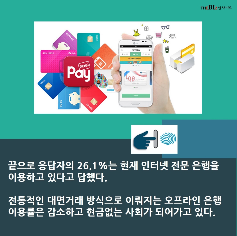 끝으로 응답자의 26.1%는 현재 인터넷 전문은행을 이용하고 있다고 답했다. 전통적인 대면거래 방식으로 이뤄지는 오프라인 은행 이용률은 감소하고 현금없는 사회가 되어가고 있다.