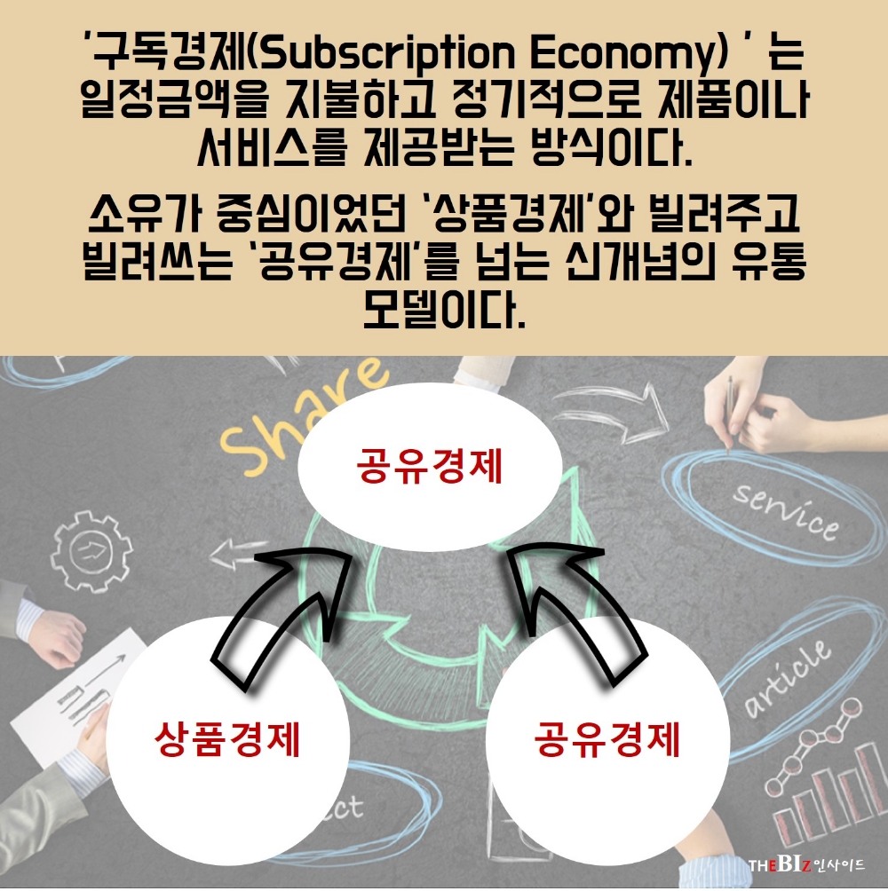 '구독경제(Subscription Economy)'가 가파르게 확산되고 있다. 구독경제는 일정금액을 지불하고 정기적으로 제품이나 서비스를 제공하는 방식이다. 소유가 중심이었던 ‘상품경제’와 빌려주고 빌려쓰는 ‘공유경제’를 넘는 신개념의 유통 모델이다.