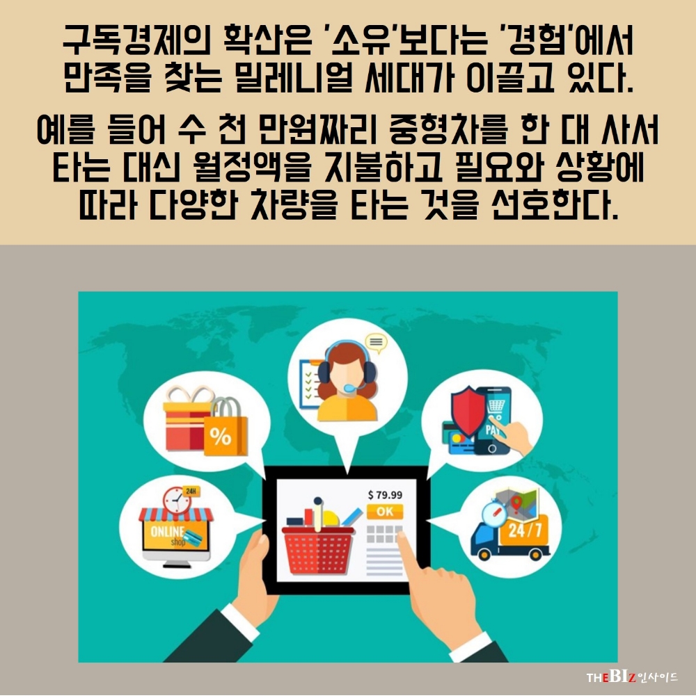 구독경제의 확산은 '소유'보다는 '경험'에서 만족을 찾는 밀레니얼 세대(1986~1991년 출생 세대)가 이끌고 있다. 예를 들어 수 천 만원짜리 중형차를 한 대 사서 타는 대신 월정액을 지불하고 필요와 상황에 따라 다양한 차량을 타는 것을 더 선호한다는 것이다. 이것은 소유에 의미를 두지 않기 때문에 가능한 얘기다.