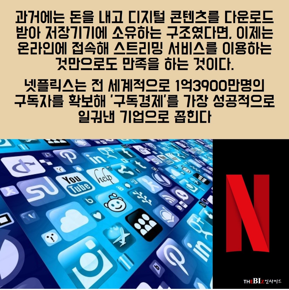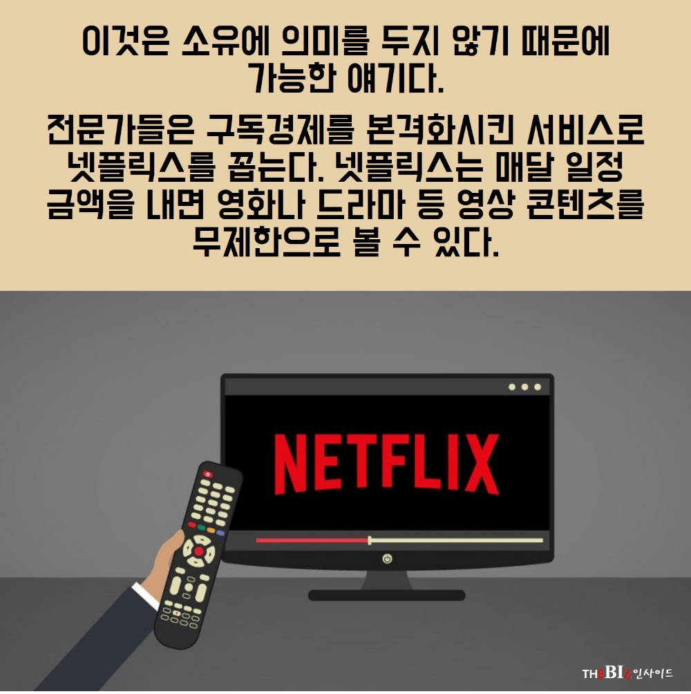 과거에는 돈을 내고 디지털 콘텐츠를 다운로드 받아 저장기기에 소유하는 구조였다면, 이제는 온라인에 접속해 스트리밍 서비스를 이용하는 것만으로도 만족을 하는 것이다. 넷플릭스는 전 세계적으로 1억3900만명의 구독자를 확보해 '구독경제'를 가장 성공적으로 일궈낸 기업으로 꼽힌다.