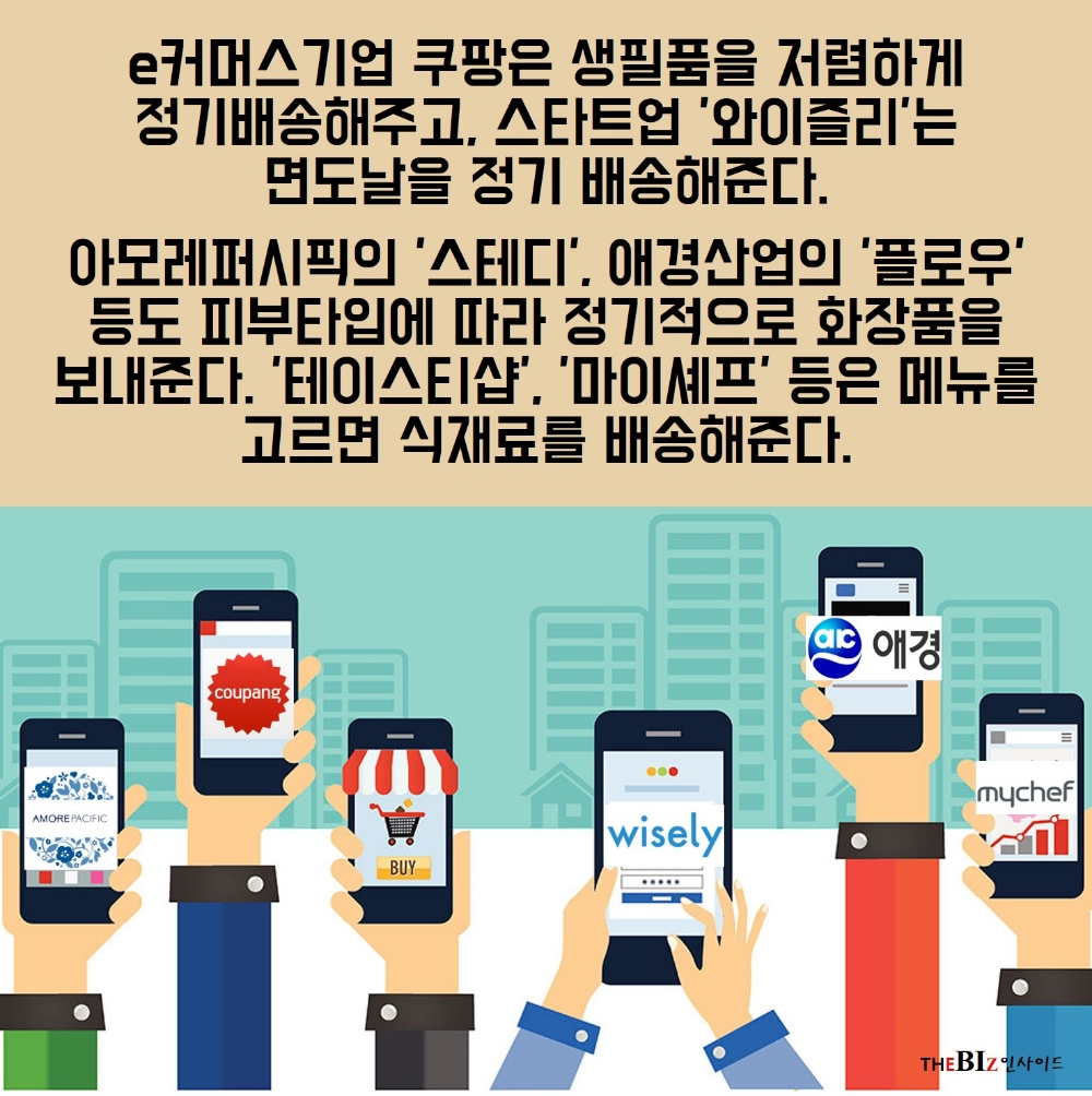 e커머스기업 쿠팡은 생필품을 저렴하게 정기배송해주고, 스타트업 '와이즐리'는 면도날을 정기 배송해준다. 아모레퍼시픽의 '스테디', 애경산업의 '플로우' 등도 피부타입에 따라 정기적으로 화장품을 보내준다. '테이스티샵', '마이셰프' 등은 메뉴를 고르면 식재료를 배송해준다.