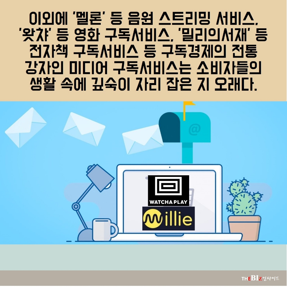 이외에 '멜론' 등 음원 스트리밍 서비스, '왓챠' 등 영화 구독서비스, '밀리의서재' 등 전자책 구독서비스 등 구독경제의 전통 강자인 미디어 구독서비스는 소비자들의 생활 속에 깊숙이 자리 잡은 지 오래다.