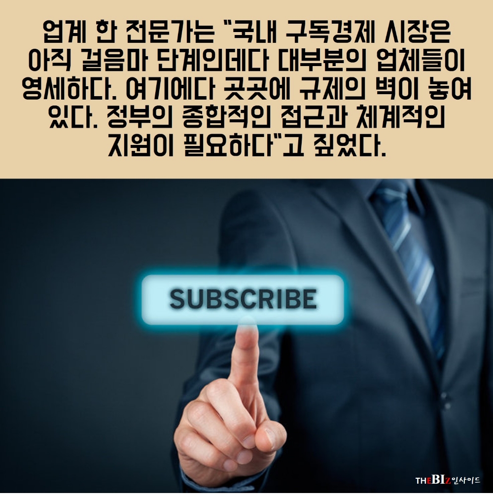 업계 한 전문가는 "국내 구독경제 시장은 아직 걸음마 단계인데다 대부분의 업체들이 영세하다. 여기에다 곳곳에 규제의 벽이 놓여 있다. 정부의 종합적인 접근과 체계적인 지원이 필요하다"고 짚었다.