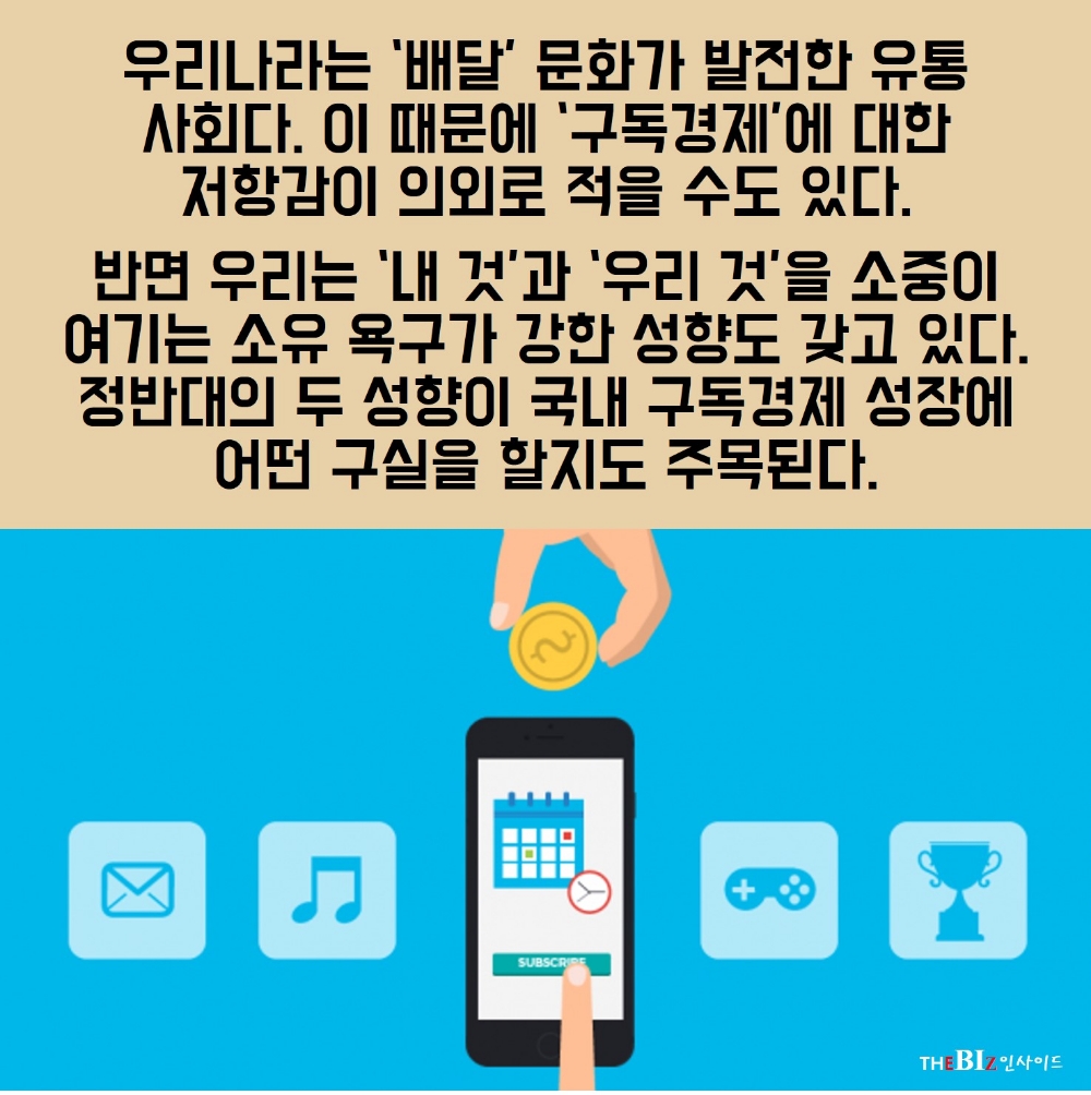 우리나라는 ‘배달’ 문화가 발전한 유통 사회다. 이 때문에 ‘구독경제’에 대한 저항감이 의외로 적을 수도 있다. 반면 우리는 ‘내 것’과 ‘우리 것’을 소중이 여기는 소유 욕구가 강한 성향도 갖고 있다. 정반대의 두 성향이 국내 구독경제 성장에 어떤 구실을 할지도 주목된다.