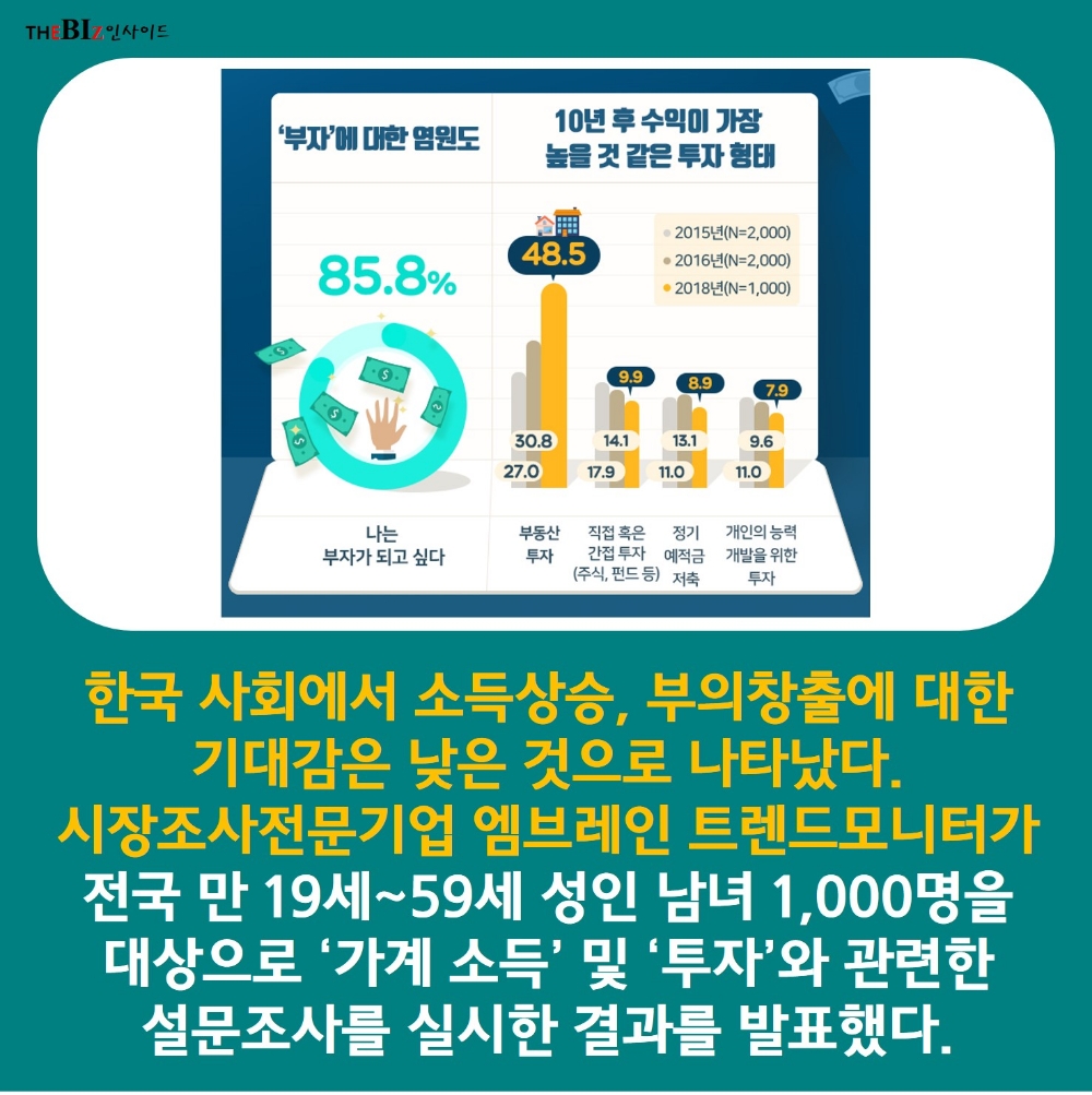 한국 사회에서 소득상승, 부의 창출에 대한 기대감은 낮은 것으로 나타났다. 시장조사전문기업 엠브레인 트렌드모니터)가 전국 만 19세~59세 성인 남녀 1,000명을 대상으로 ‘가계 소득’ 및 ‘투자’와 관련한 설문조사를 실시한 결과를 발표했다.