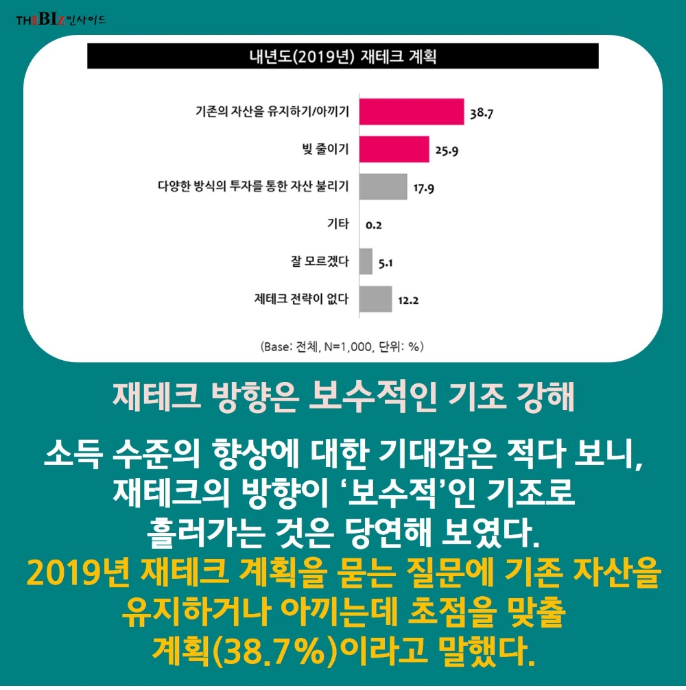 소득 수준의 향상에 대한 기대감은 적다 보니, 재테크의 방향이 ‘보수적’인 기조로 흘러가는 것은 당연해 보였다. 2019년 재테크 계획을 묻는 질문에 기존 자산을 유지하거나 아끼는데 초점을 맞출 계획(38.7%)이라고 말하는 소비자가 가장 많은 비중을 차지한 것이다.