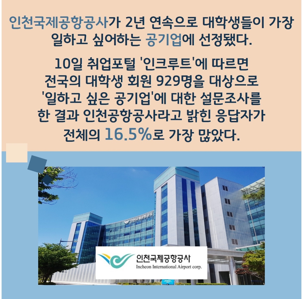 인천국제공항공사가 2년 연속으로 대학생들이 가장 일하고 싶어하는 공기업에 선정됐다.
