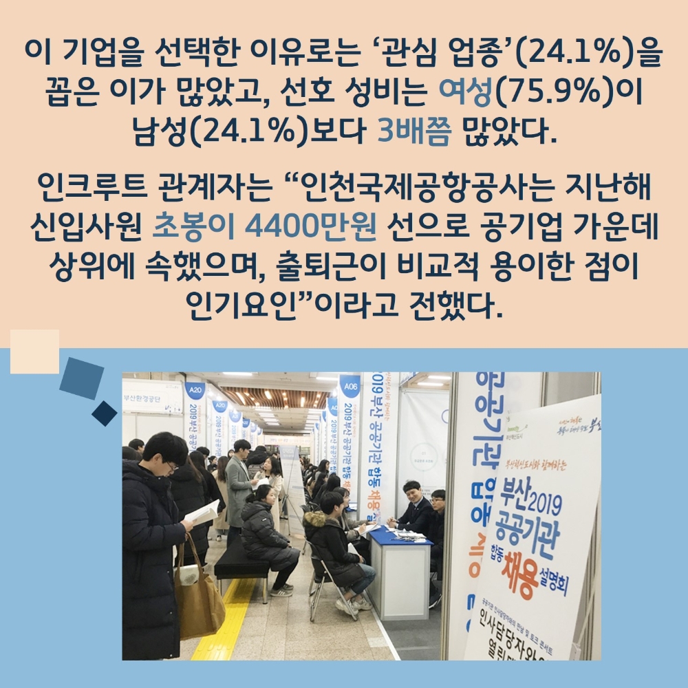 이 기업을 선택한 이유로는 ‘관심 업종’(24.1%)을 꼽은 이가 많았고, 선호 성비는 여성(75.9%)이 남성(24.1%)보다 3배쯤 많았다. 인크루트 관계자는 “인천국제공항공사의 지난해 신입사원 초봉은 4400만원 선으로 공기업 중에서도 상위에 속하는 데다, 수도권에 위치해 다른 공공기관보다 출퇴근이 비교적 용이한 점이 인기 요인”이라고 전했다.