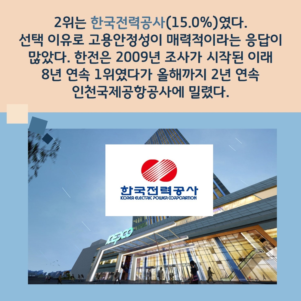 2위는 한국전력공사(15.0%)였다. 선택 이유로는 고용안정성이 매력적이라는 응답이 많았다. 한전은 2009년 조사가 시작된 이래 8년 연속 1위였다가 올해까지 2년 연속 인천국제공항공사에 밀렸다.