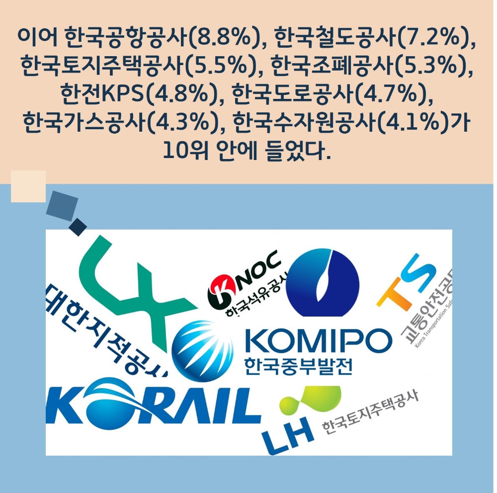 이어 한국공항공사(8.8%), 한국철도공사(7.2%), 한국토지주택공사(5.5%), 한국조폐공사(5.3%), 한전KPS(4.8%), 한국도로공사(4.7%), 한국가스공사(4.3%), 한국수자원공사(4.1%)가 10위 안에 들었다.
