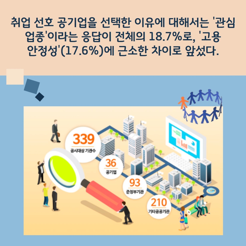 취업 선호 공기업을 선택한 이유에 대해서는 '관심 업종'이라는 응답이 전체의 18.7%로, '고용 안정성'(17.6%)에 근소한 차이로 앞섰다.