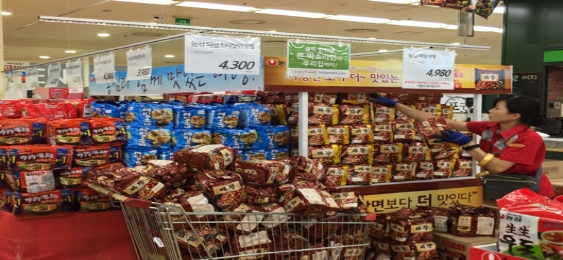 멀찌감치 바라보니, 이들은 한 켠에 진열된 특정 '인스턴트 면' 제품을 쇼핑카트에 싣고 있었다. 무더위가 계속되고 있기에 여름철 특수 제품인 인스턴트 '냉면'을 구매하는가 했다.