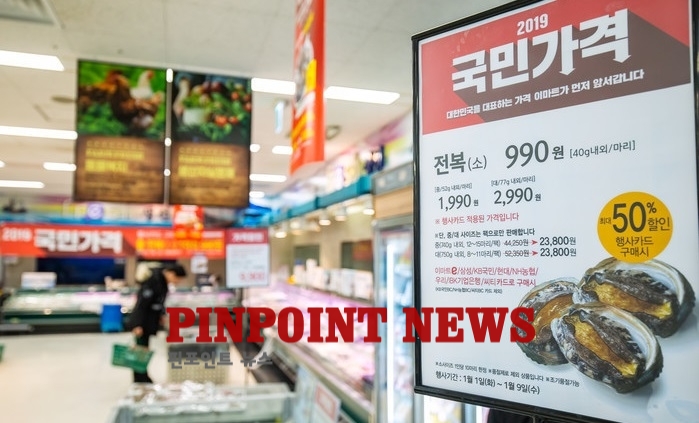 가장 인파가 밀집돼 있던 곳은 수산물 코너였다. 해당 장소에선 국민가격 첫 상품인 전복(소)를 50% 할인한 가격인 990원에 내놓고 있다. 평소 비싼 가격 때문에 전복 구매를 꺼리던 소비자들도 저렴한 가격에 맛볼 수 있도록 대표적인 고급 식재료 전복을 국민가격 첫 상품으로 선정했다는 것이 이마트 측 설명이다.