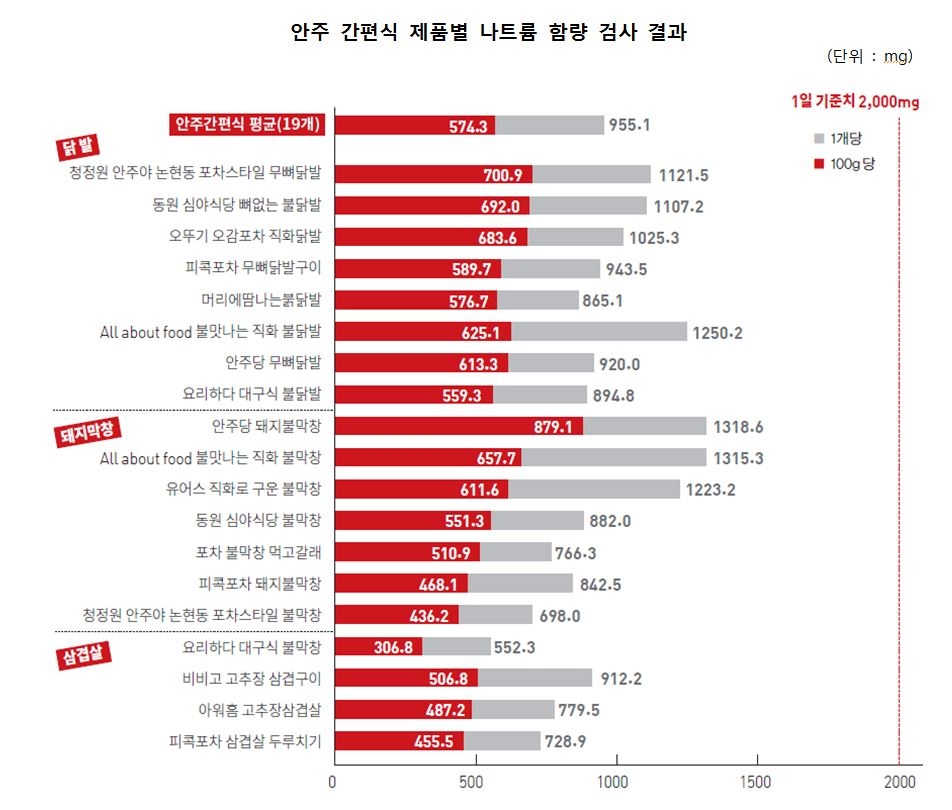 이번 검사 대상 제품은 대형마트와 편의점에서 판매하는 안주 간편식 19개(닭발 8개·돼지막창 8개·삼겹살 3개)로, 5월 25일부터 6월 14일까지 공인시험기관에서 나트륨 함량과 열량 등을 조사했다.