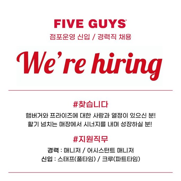 이번 신규 채용은 신입 파트타이머부터 경력 매니저까지 다양하다. 만 18세 이상 지원 가능하며 채용된 인원은 파이브가이즈 강남 또는 10월 문을 여는 여의도점에서 근무하게 된다.