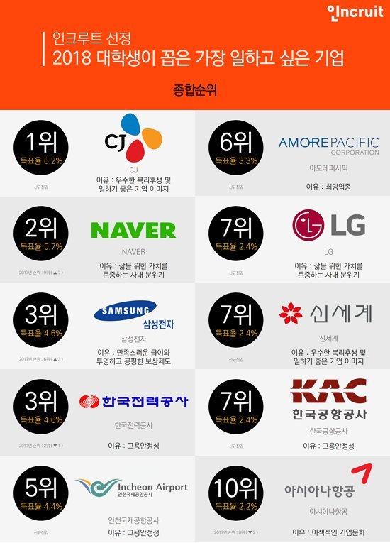 인크루트는 "올해 조사 결과에서 가장 인상적인 부분은 그룹사와 공기업의 도약"이라면서 "CJ그룹의 경우 CJ E&M과 CJ제일제당 등 주요 계열사가 꾸준히 상위권에 있었으나 CJ가 톱10에 포함된 것은 8년 만에 처음"이라고 설명했다.