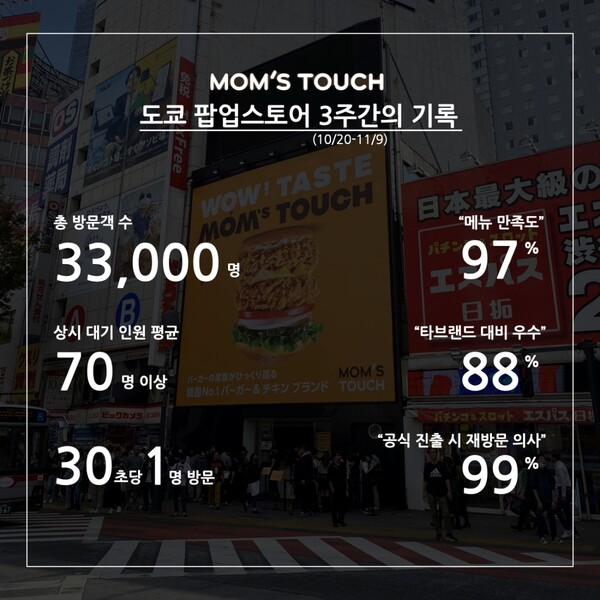 방문 고객들의 호평도 이어졌다. 맘스터치가 방문 고객을 대상으로 이용 경험에 대해 설문 조사한 결과, ‘메뉴에 만족한다’는 응답은 무려 97%에 달했고, 기존 현지 브랜드와 비교 시 88%가 ‘타브랜드보다 우수하다’고 평가했으며, ‘맘스터치 정식 매장 오픈 시 재방문하겠다’고 밝힌 응답자는 99%에 달했다. 응답자의 93%가 ‘일본 시장에서 경쟁력이 있다’고 답했으며, 78%가 맛과 품질을 그 이유로 꼽았다.