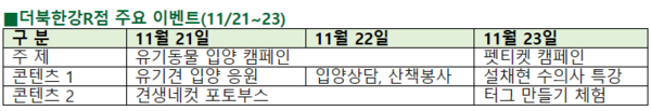 리뉴얼 오픈에 맞춰 동물보호단체 ‘동물과 함께 행복한 세상’과 손잡고 더북한강R점에서 유기동물 입양 캠페인을 비롯한 다채로운 프로그램을 선보인다.